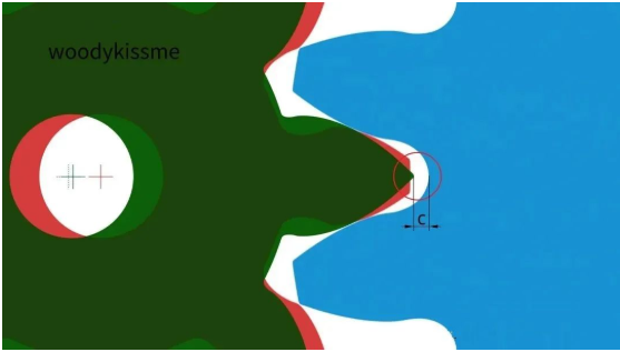 因此,为了实现无侧隙啮合,齿轮必须一起移动一点。稍微减少中心距,但与标准齿轮相比仍然很大。与此同时,齿顶与另一个齿轮的齿根之间的间隙 c 减小(见下图)。这可能需要缩短齿顶圆以保持一定的间隙。