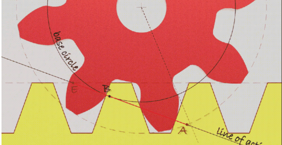 为了避免根切,基圆与啮合线的交点 B 必须位于接触线 AE 之外。在要避免根切的极限情况下,根切的起点与作用线的终点重合。“形成齿条”在它根切之前能退出齿轮。