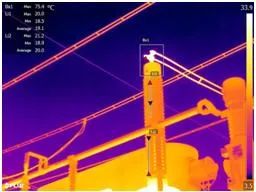 从热成像图中可见,接近中压套管线夹处附近导线成螺旋状过热分布,线夹左侧与导线接线处温度最高,热点温度最高为初测日拍摄的75.4℃,最高温升为57.5K。