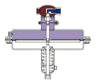 工作过程:当入口P1的压力升高时,出口P2压力会有随之升高的趋势,P2压力的微笑升高会透过膜片作用到下面大的气室里,在大膜片的放大作用下,弹簧会被压缩,则与弹簧相连的阀芯会向减小阀门开度的方向运动,这样就减少了流量和出口压力P2,从而达到了出口P2稳压的目的;反之亦然。